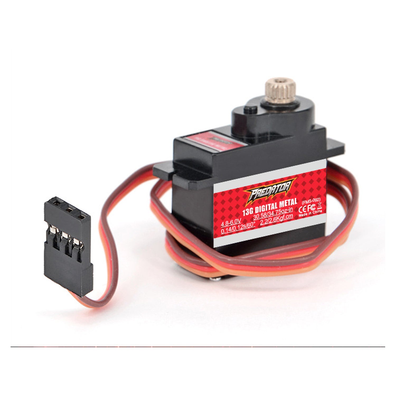 Das FMS 13G Predator Servo verfügt über eine Nennspannung von 4,8 bis 6,0 V und ein Drehmoment von bis zu 1,8 kg-cm bei 4,8 V. Die Abmessungen des Servos betragen 22,5 x 11,5 x 24 mm und es wiegt lediglich 13 Gramm. Das Servo ist somit sehr leicht und kompakt, was es ideal für den Einsatz in kleineren Modellen macht.